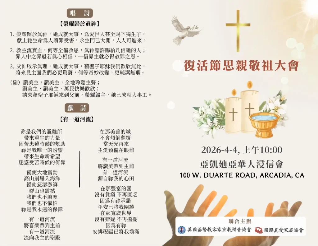 今年復活節正逢華人的清明節,一場融合基督信仰與華人傳統美德的「復活節思親敬祖大會」,於 2026 年 4 月 4 日在亞凱迪亞華人浸信會(Arcadia Chinese Baptist Church)莊嚴登場。本次大會由「國際真愛家庭協會」與「美國客家宣教福音協會」首度攜手舉辦,吸引百餘位各界人士齊聚,共同見證信仰如何轉化傳統文化。