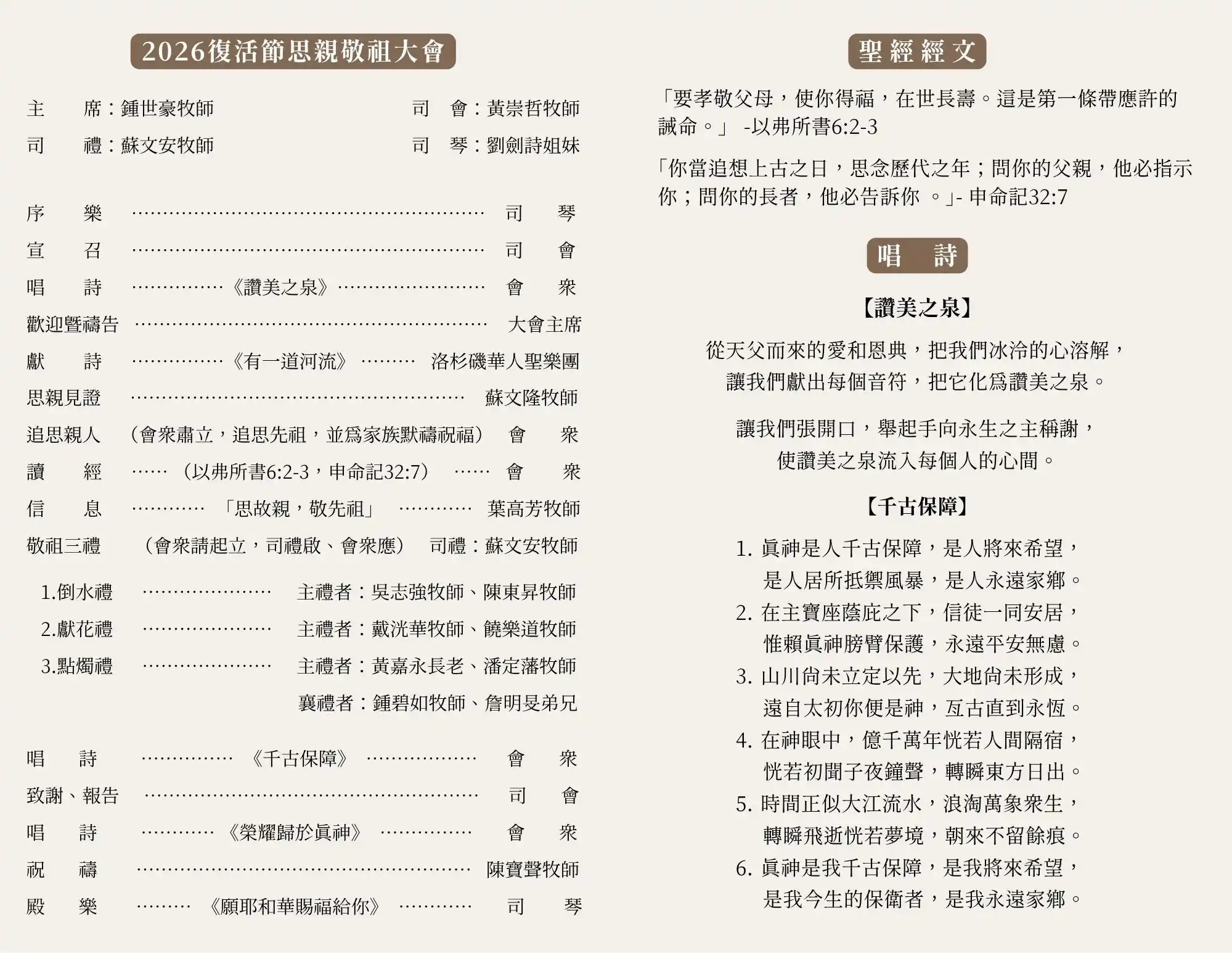 大會由鍾世豪牧師擔任主席,葉高芳牧師分享信息,蘇文隆牧師則透過感人見證,述說信仰在家族傳承中的力量。活動高潮是由蘇文安牧師主領的「敬祖三禮」,透過創新且莊嚴的儀式,賦予傳統習俗嶄新的屬靈意義: